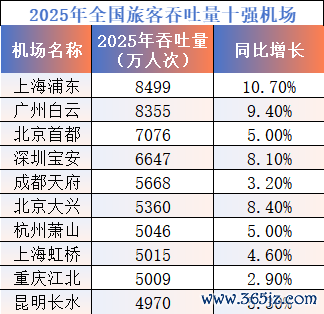 时代周报记者梳理全国200多个机场2025年旅客吞吐量走势发现,过去一年全国旅客吞吐量前十强名单未有变化,不过在具体名次上有所变动。
